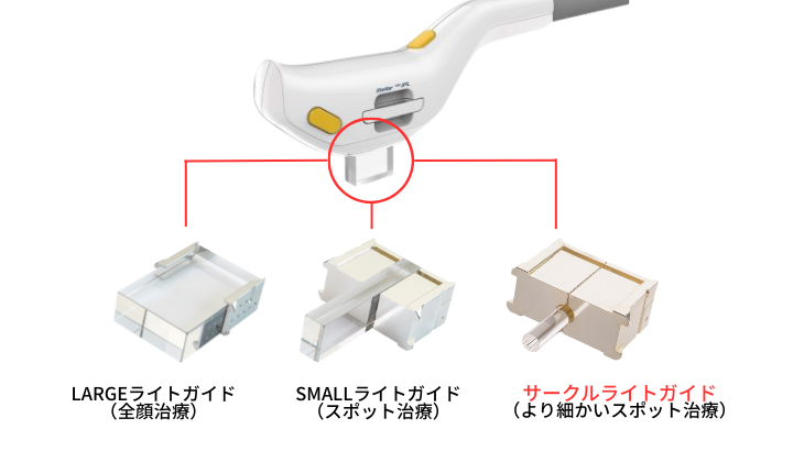さらに、当院ではポイント照射ができる「サークルライトガイド」というアタッチメントを採用しています。 一般的な広い面積のチップでは届きにくかった、鼻周りの細かい血管や、目元のキワにある小さなシミ。そんな「あと少し、ここを狙いたい!」という繊細な部分まで、ピンポイントに、かつ安全に光を届けることができます。
