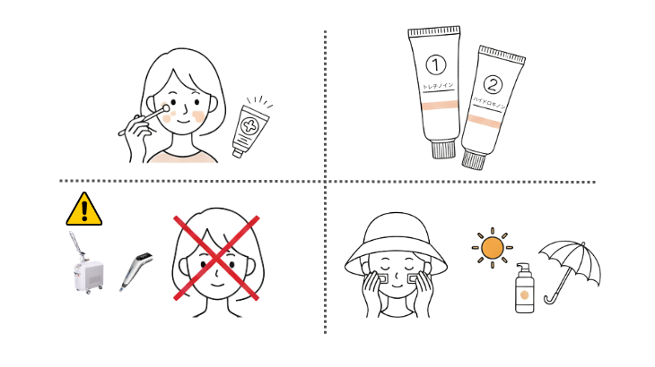 トレチノインを使い始めると、赤み、ヒリヒリ感、皮剥けなどが起こることがあります。これは、お肌が新しく生まれ変わっている証拠。 もし不安になったら、すぐにスタッフへ相談してくださいね。一人ひとりの反応に合わせて、塗り方のコツをアドバイスします!