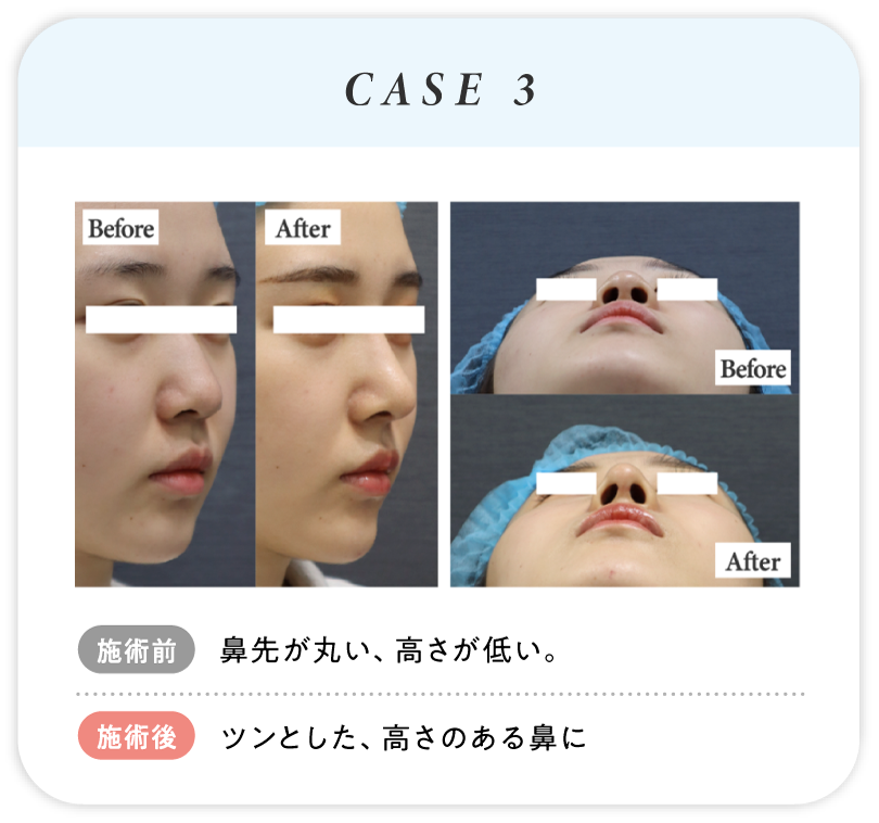 コンプレックスだった低い鼻筋と横に広がった鼻先を、鼻フル整形で一気に解消できました。手術当日は全身麻酔で行い、痛みはなかったです。先生から事前に説明があった通りの経過でした。仕上がりは大満足です。特に横顔が劇的に改善され、自信を持てるようになりました。術後3ヶ月経った今では、まるで生まれつきの自然な仕上がりです。