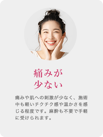 個人差はありますが、施術中は軽い熱感やチクチク感を感じることがありますが、多くの方が耐えられる範囲です。