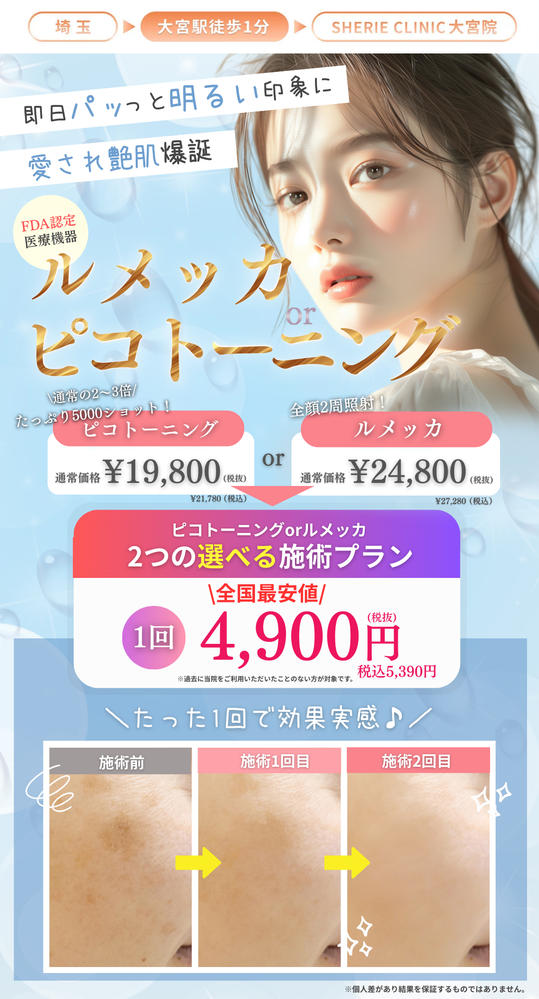 他のクリニックでシミ治療を受けたことがありましたが、ここまで丁寧に重ね打ちし、さらに気になるところを打ってくれるところはありませんでした。いつもクーポンで色々なクリニックをまわっていますが、今後はシェリーで治療していく予定です。