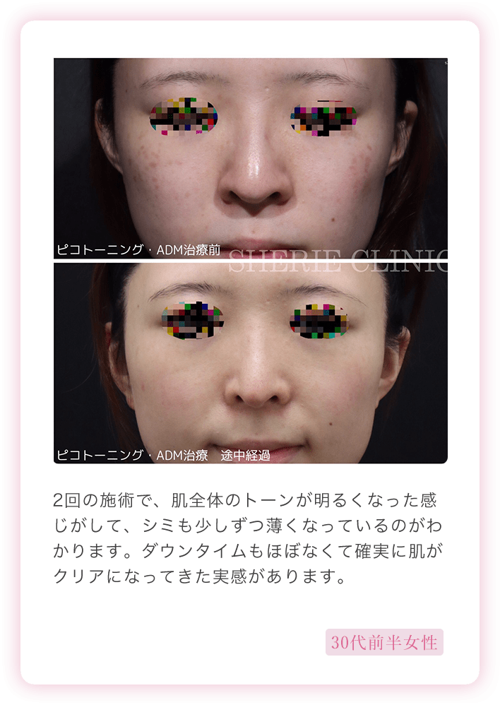 当院では、米国FDAの承認を受けた医療用美肌レーザー機器を使用しておりシミ・そばかす・肝斑・ADMなどの色素性病変に対して、高い効果と安全性が証明されていますので、安心して治療を受けていただけます。