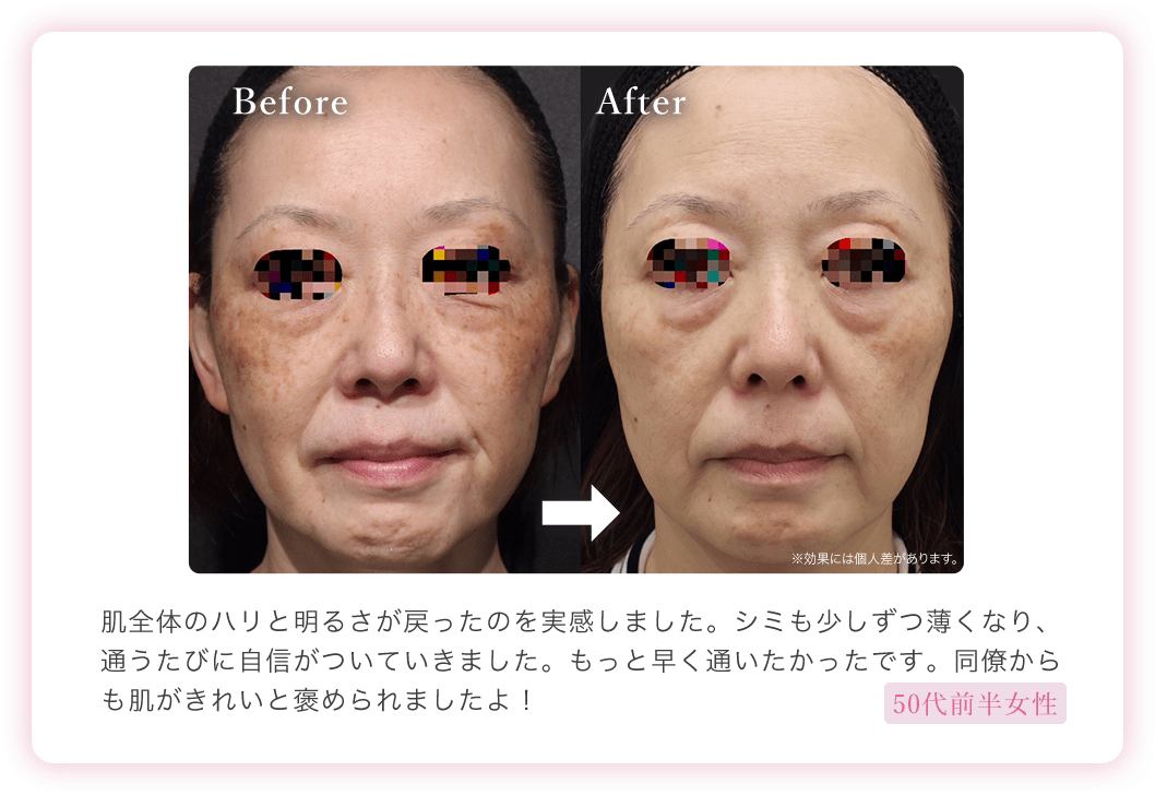 当院では、経験豊富な医師が肌状態を丁寧に診断し、最適な治療をご提案いたします。シミやくすみにはさまざまな種類があり、それぞれに適した照射方法があります。